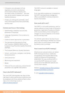 تم تصميم الدورة الأساسية ل EUPC خصيصا لتوفير المعرفة الوقائية الأساسية لصانعي القرار والرأي والسياسات حول التدخلات والنهج الوقائية الأكثر فعالية القائمة على الأدلة من أجل تسهيل الخيارات المستنيرة حول أولويات التمويل والتنفيذ.