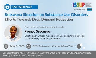 Tématem webináře je "Situace v Botswaně v oblasti poruch spojených s užíváním návykových látek: úsilí o snížení poptávky po drogách". Jsme nadšeni, že vám můžeme přinést prezentaci pana Phenyo Sebonega, hlavního hygienika, divize zneužívání alkoholu a návykových látek na Ministerstvu zdravotnictví Botswany.