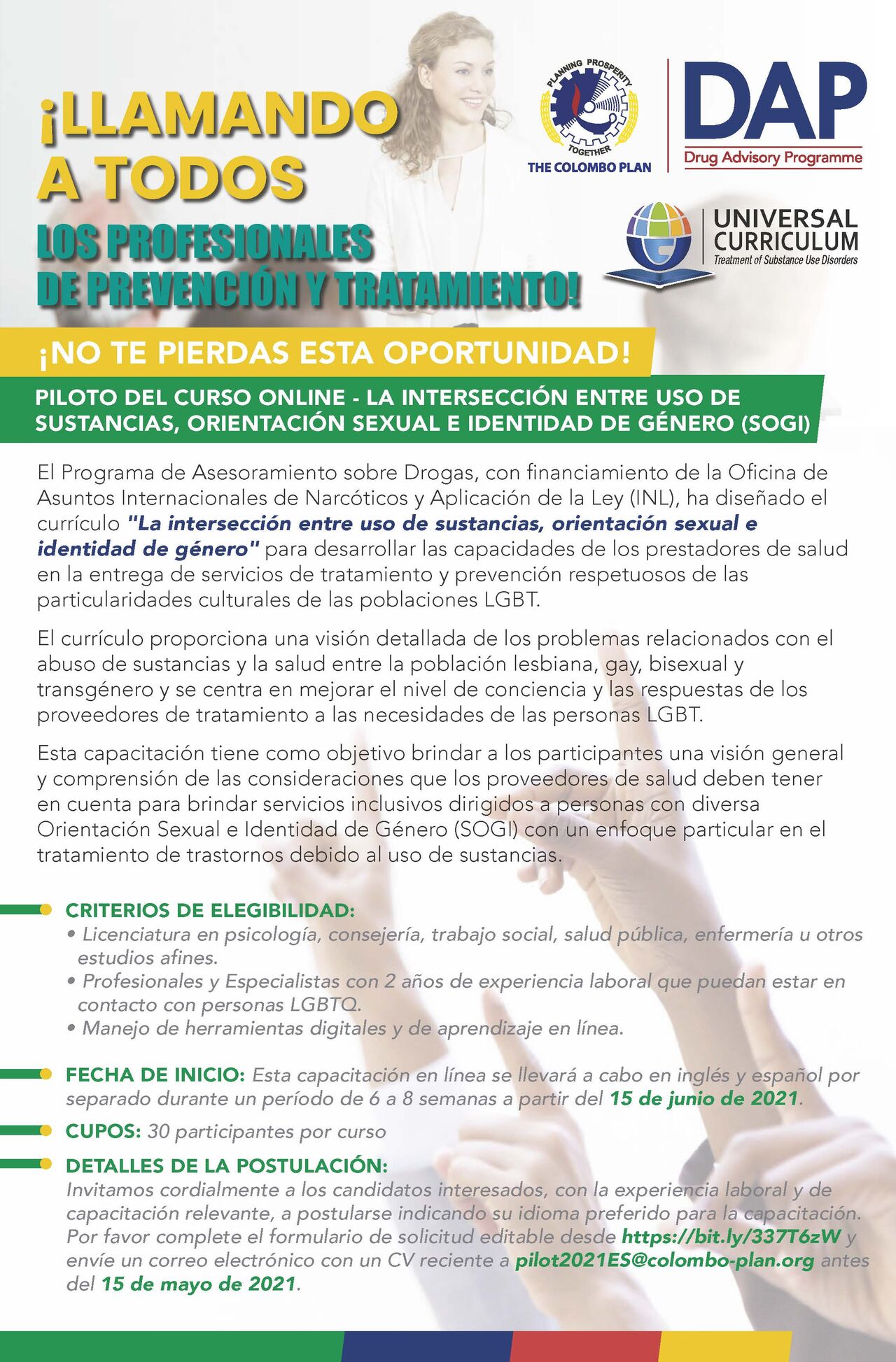 Detalles del próximo curso SOGI del Programa de Asesoramiento sobre Drogas del Plan Colombo (CPDAP) que se llevará a cabo a partir del 15 de junio de 2021.