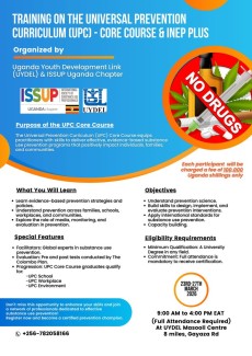 ISSUP Uganda Chapter, in partnership with Uganda Youth Development Link (UYDEL), is pleased to announce an in-person Training on the Universal Prevention Curriculum (UPC) – Core Course & INEP Plus, taking place from 23rd–27th March 2026 at UYDEL Masooli Centre, 8 Miles, Gayaza Road, Uganda.