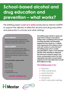 School-Based Alcohol and Drug Education and Prevention – What Works? is a new briefing paper published by Mentor-Adepis. It outlines several approaches that have been shown to work effectively, and issues cautions about those that have not. The document is intended as a guide that will equip those working in educational settings with the knowledge to decide on which alcohol and drug education prevention programme is the most suitable for them, while ensuring maximum impact and enabling young people to build their resilience to risk.