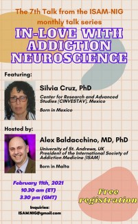 February 11, starting at 10:30 AM (Washington, DC time), the Neuroscience Interest Group at the International Society of Addiction Medicine (ISAM NIG) invites you to the free virtual talk "In-Love with Addiction Neuroscience," presented by Dr. Silvia Cruz and hosted by Prof. Alexander Baldacchino.