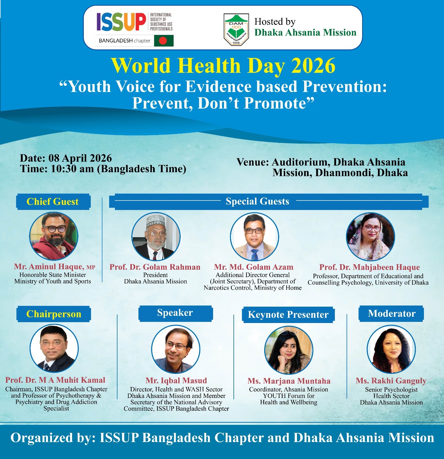 To observe World Health Day 2026, “Youth Voice for Evidence based Prevention: Prevent, Don’t Promote” the youth seminar will be held on 08 April 2026 at 10:30 am (Bangladesh Time) at the Auditorium of Dhaka Ahsania Mission, Dhanmondi, Dhaka. The event is organized by jointly ISSUP Bangladesh Chapter and Dhaka Ahsania Mission and will bring together national and international experts, policymakers, youth leaders, and health service providers working in substance use prevention, treatment, and recovery support.