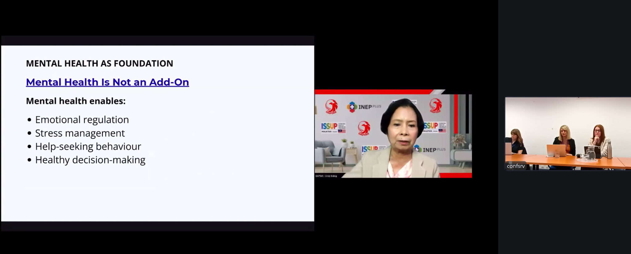 Representing Malaysia, Cindy Biding, President of the Organisation for Addiction Prevention, Treatment and Recovery (OAPTAR) and ISSUP Malaysia Chapter lead, shared perspectives from school- and family-based prevention initiatives that integrate mental health and social-emotional learning.