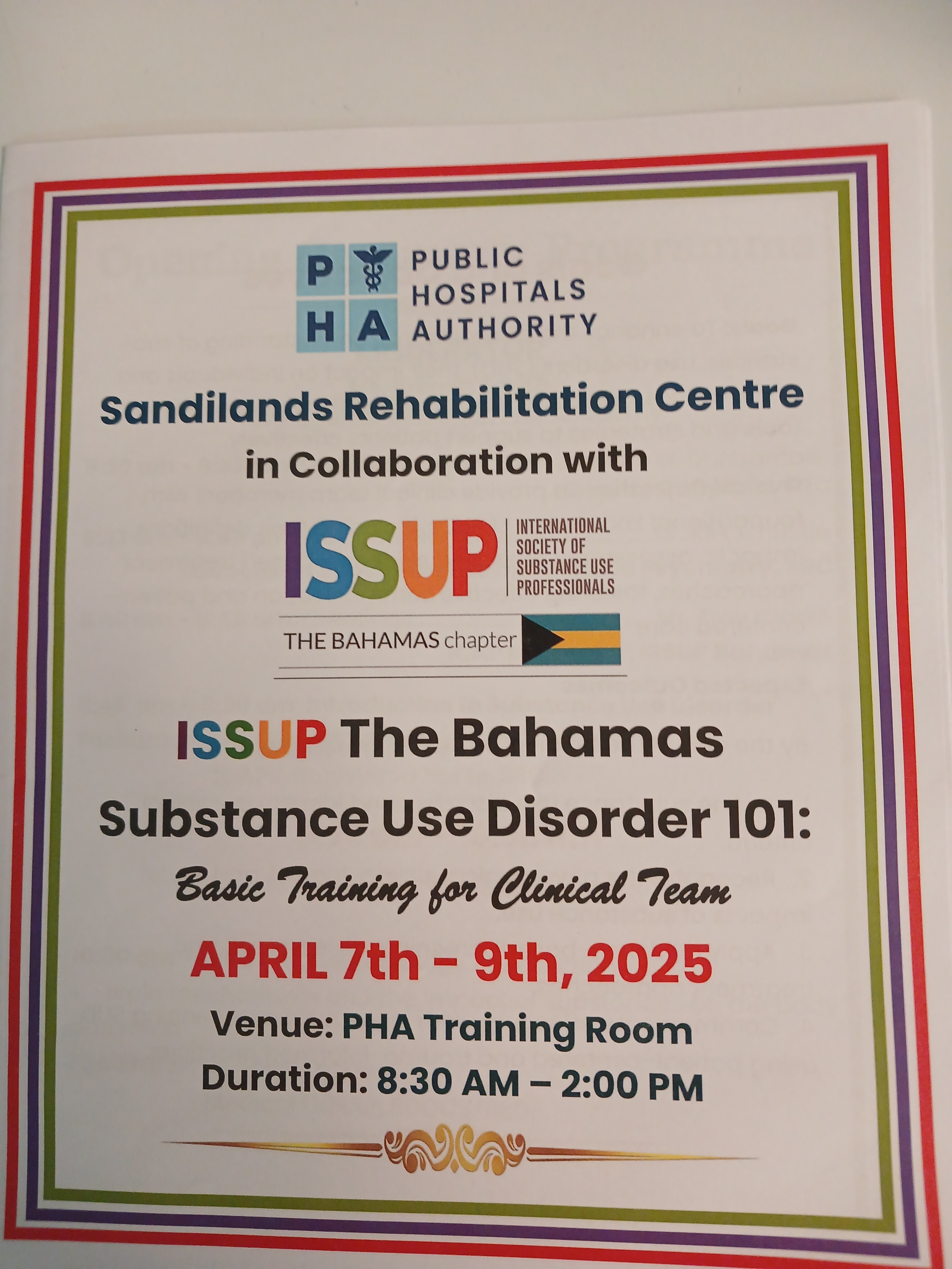 - The International Society of Substance Use Professionals (ISSUP) Bahamas Chapter, whose technical guidance, professional expertise, and resource-sharing were instrumental in shaping the content and delivery of this training. Your commitment to building a skilled and informed addiction workforce in The Bahamas is commendable.