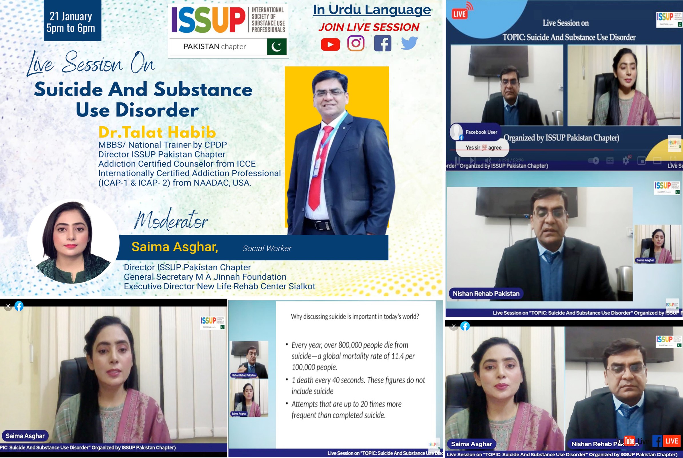 فصل ISSUP پاکستان جلسه زنده در مورد "SUCIDE و اختلال مصرف مواد" از ISSUP پاکستان فصل و جوانان انجمن صفحات فیس بوک پاکستان، کانال های یوتیوب و توییتر با سخنران مهمان دکتر اطلات حبیب دکتر پزشکی / MBBS، مربی ملی توسط CPDAP و UNODC، مدیر ISSUP پاکستان فصل، اعتیاد مشاور گواهی از ICCE،