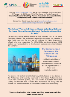 د پارلمان د غړو غونډه د فیلپین په سنا کې د قانون د قانون جوړولو د ژمنو په اړه د ارزونې په اړه د SDG د اجنډا 2030 د تعقیب په توګه د EvalColombo 2 0 1 8 د مشرانو جرګې په کوربه توب د فیلپین د مشرانو جرګې او د نړیوال پارلمان د غړو د جرګې د ارزونې په مجلس کې د 2019 کال د فبروری په 26 مه په سنا مجلس کې ترسره کیږی.