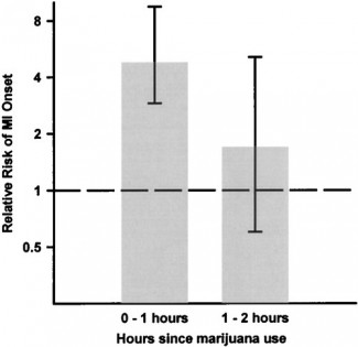 In 2001, Murray Mittleman and other researchers published the article 'Triggering Myocardial Infarction by Marijuana.' They interviewed 3,882 patients with acute myocardial infarction, on average four days after infarction onset. They used the case-crossover study design to compare the reported use of marijuana within 60 minutes preceding symptoms of myocardial infarction onset to its expected frequency using self-matched control data. The results show that in the studied population, the risk of myocardial infarction onset was elevated 4.8 times over baseline in the first hour after marijuana...