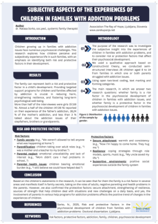 Aims of the study: The purpose of the research was to investigate subjective insight into the experiences of children in families with addiction problems, and to consider risk or protection factors that affect their psychosocial development...